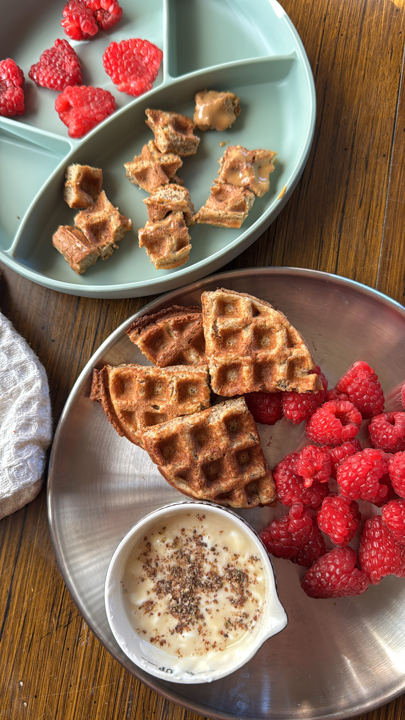 - eggs: help bind the waffles and add protein + choline + iron + vitamin D