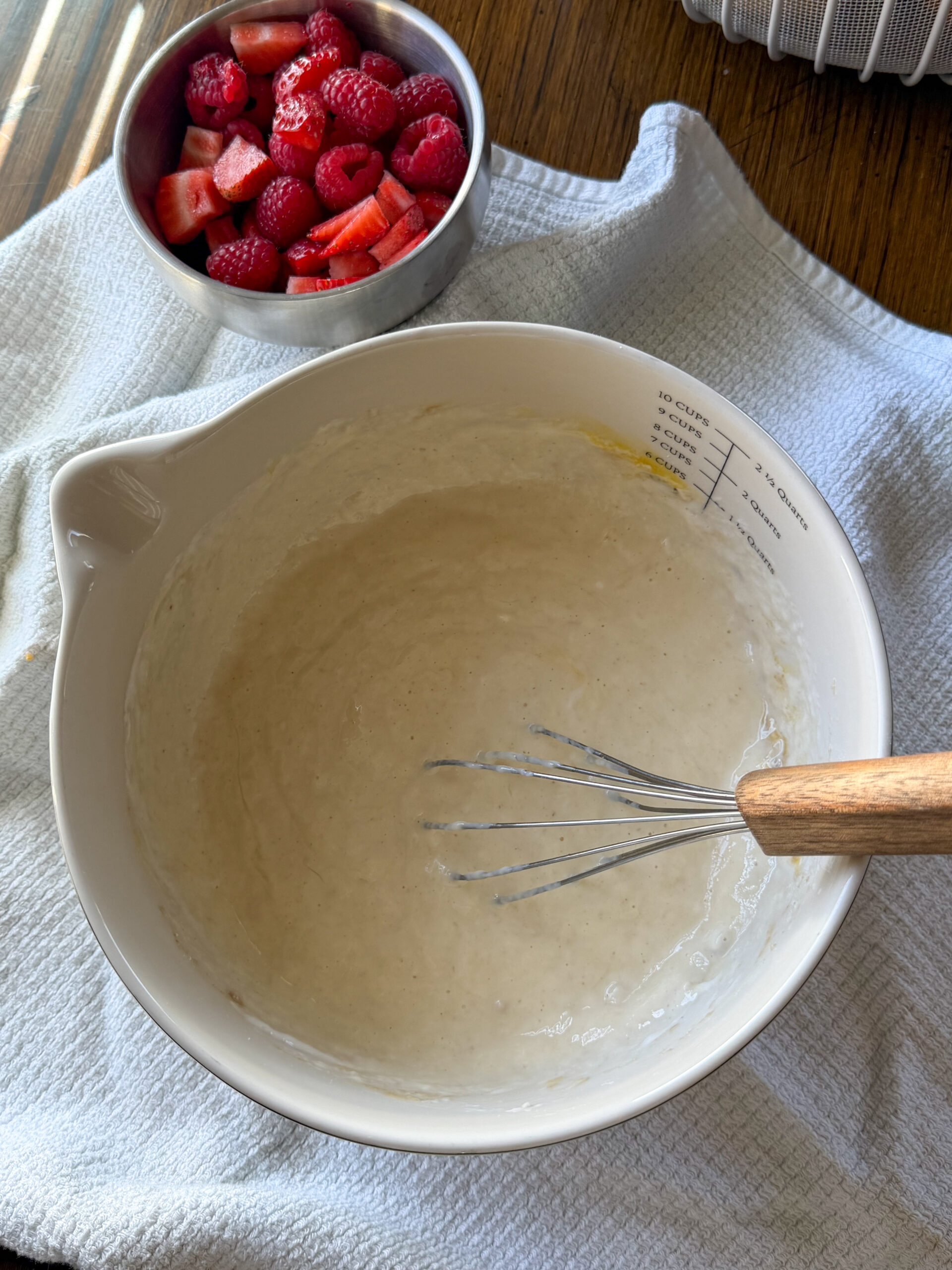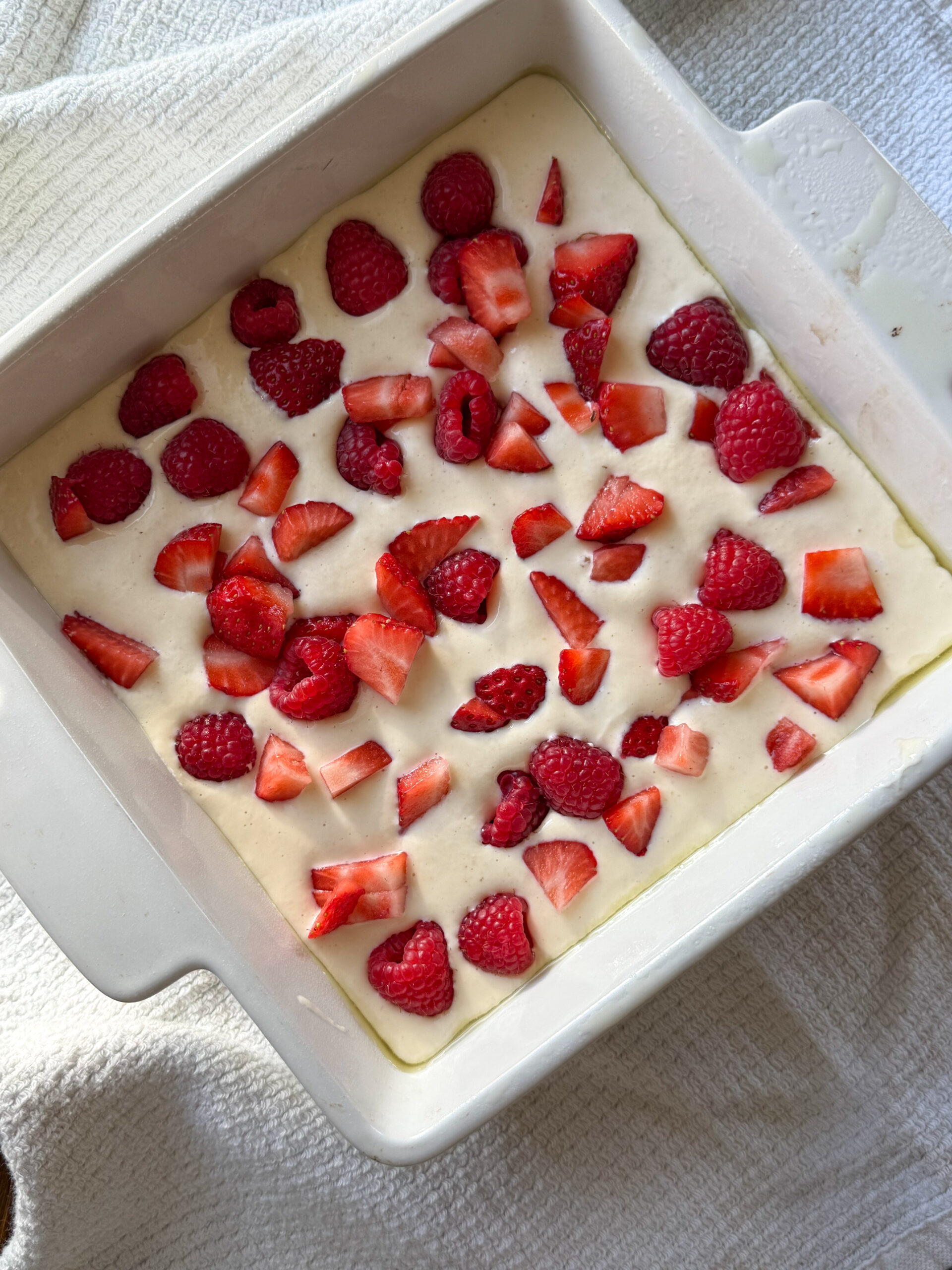 - Step 3: Pour the mixture into the prepared baking dish. Top with whatever fruit of choice (or mini chocolate chips if you'd rather that)!