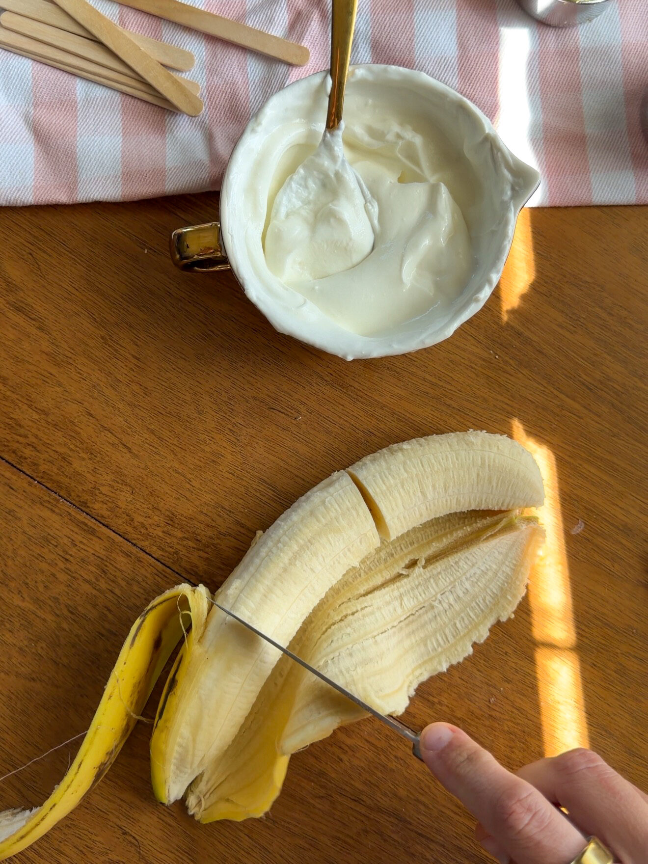- Step 3: Dip bananas into yogurt (or spread), then add your toppings (peanut butter drizzle, hemp hearts, sprinkles, etc.).