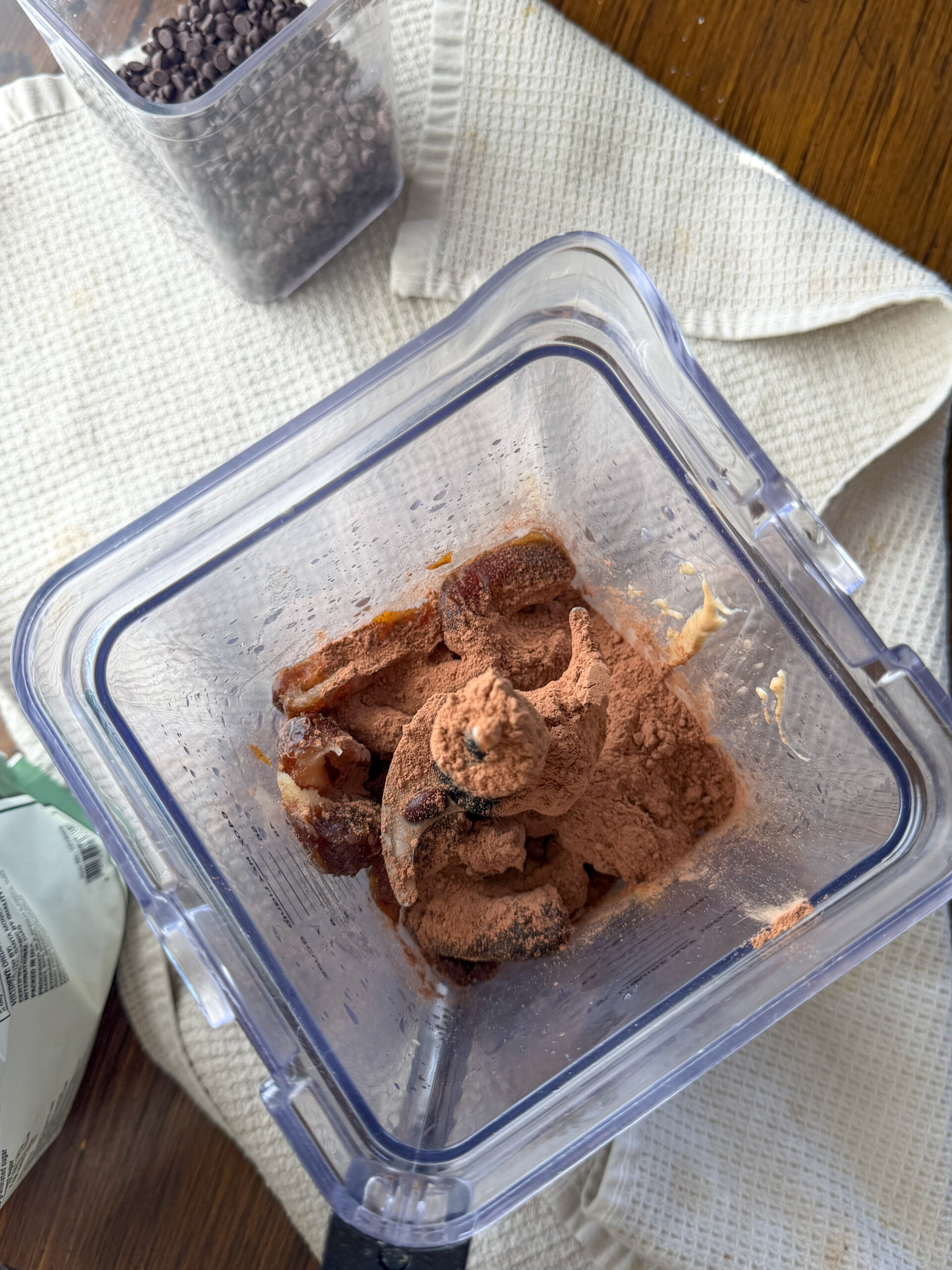 - Step 1: Soak the dates in hot water for 5-10 minutes to soften, then reserve 1-2 tablespoons of the soaking water. Add all the ingredients (besides chocolate chips) to the blender or food processor.