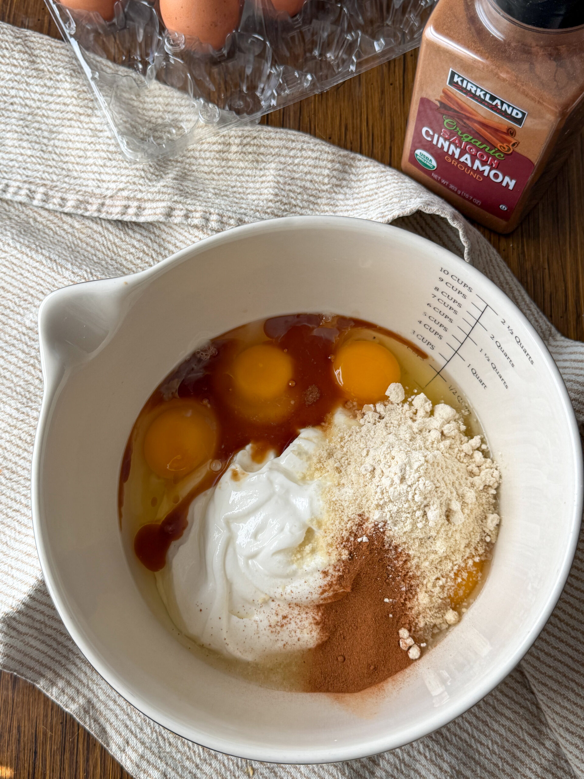 - Step 1: Preheat your oven to 350°F. Line or lightly grease an 8×8 baking dish. Add the yogurt, eggs, flour, vanilla, cinnamon, and optional maple syrup to a bowl or blender.