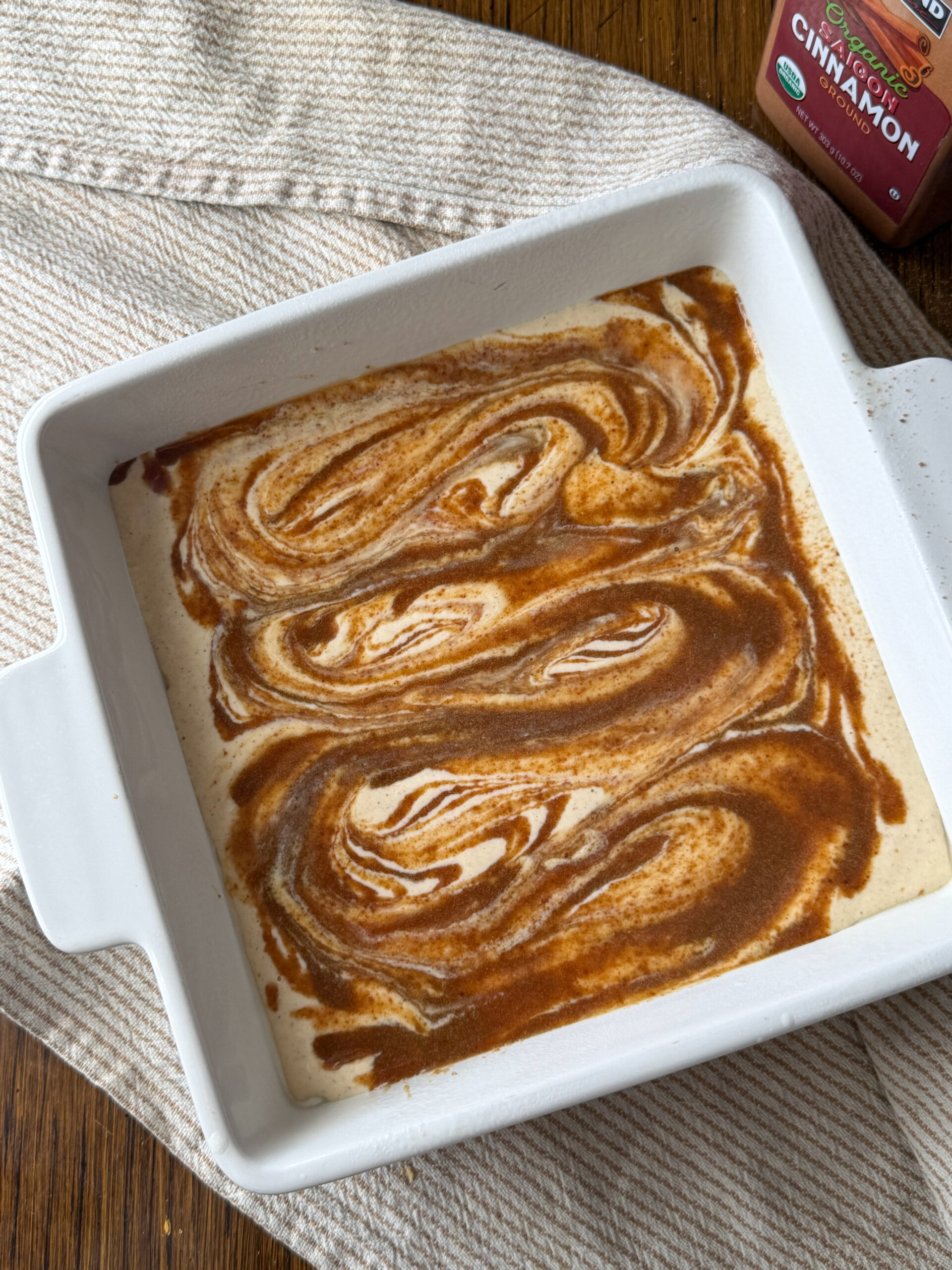 - Spoon the cinnamon mixture over the batter and gently swirl with a knife or skewer.
