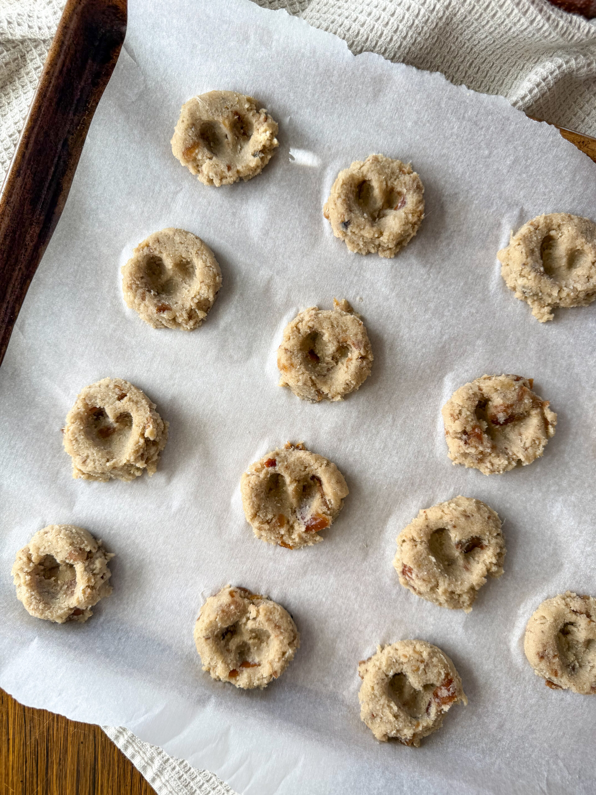 - Step 3: Place on the baking sheet and gently press a thumb or spoon into the center of each cookie.