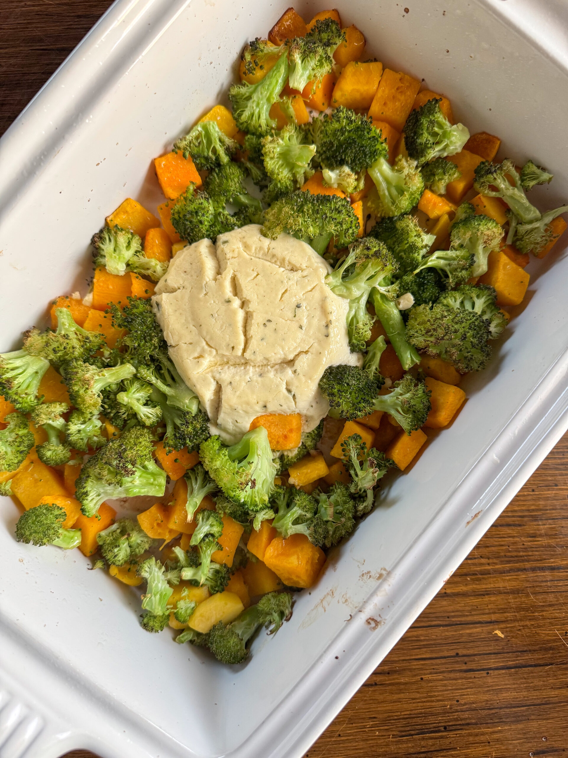 - Step 3: Once the veggies are done, mash everything together right in the baking dish! The butternut squash and Boursin form a creamy sauce, and the broccoli breaks down into it.