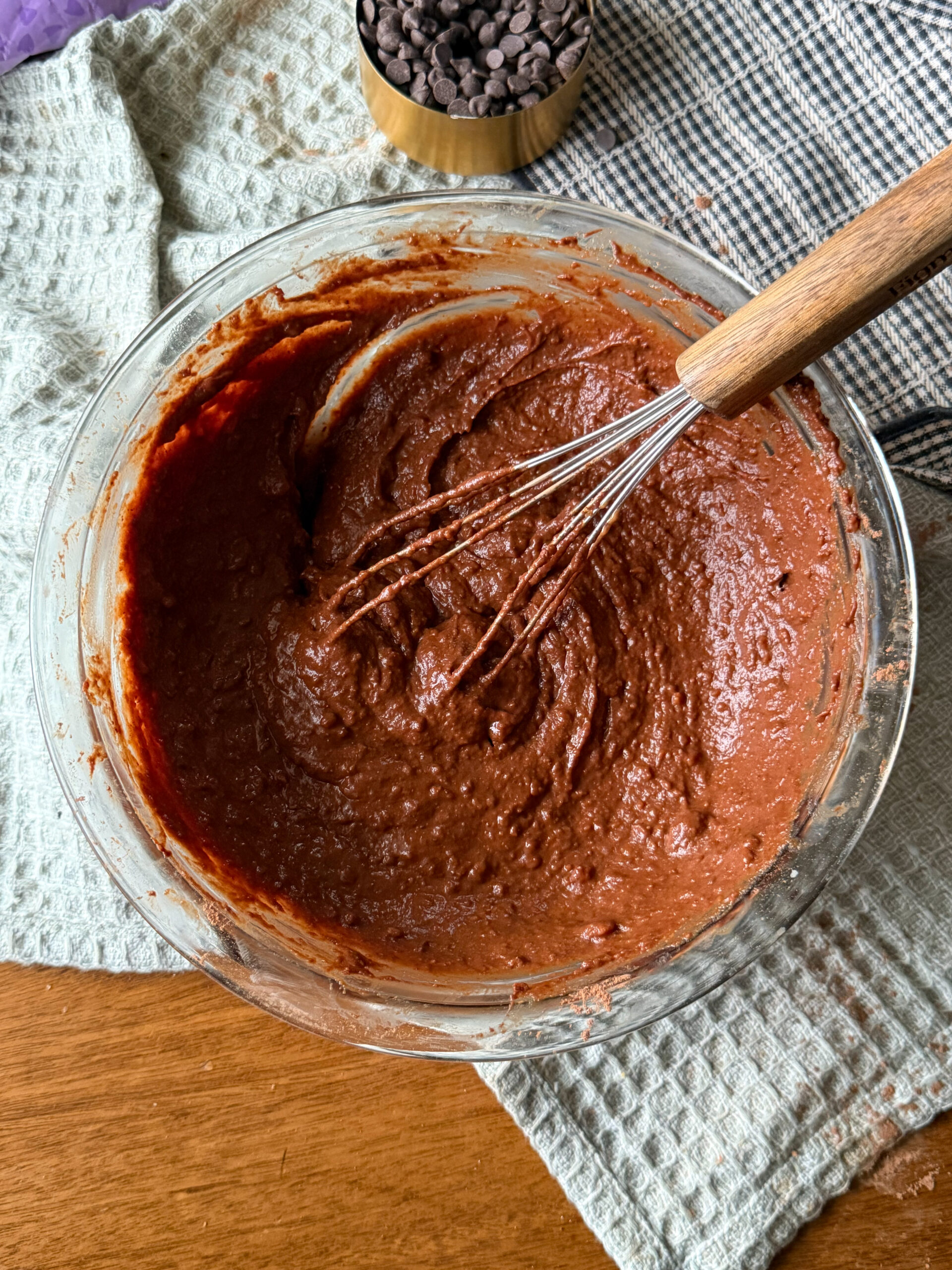 - Add cocoa powder, baking soda, and salt, mixing until a thick brownie batter forms. Fold in the chocolate chips.