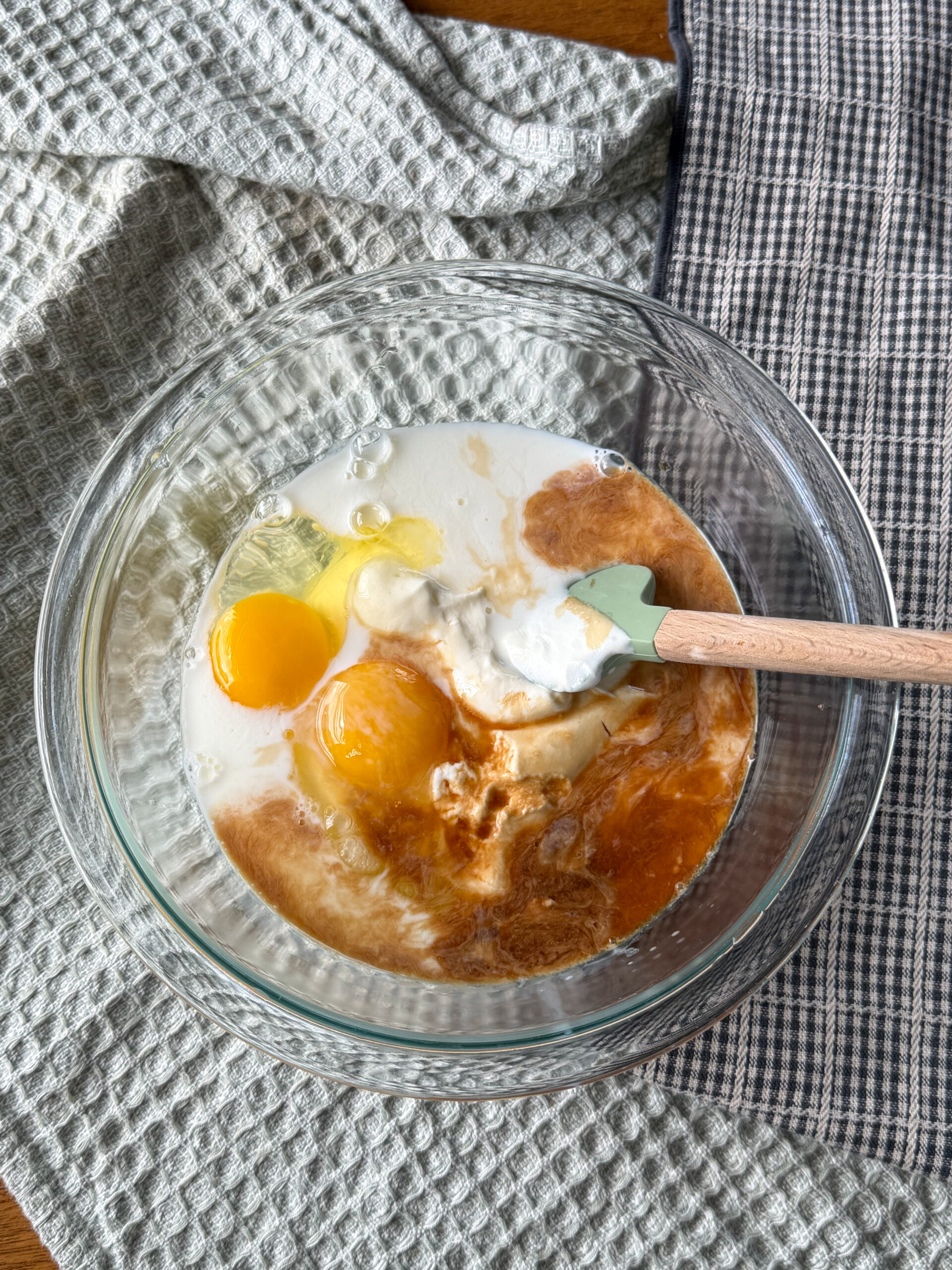 - In a large bowl whisk together eggs, Greek yogurt, milk, melted butter, and vanilla extract.