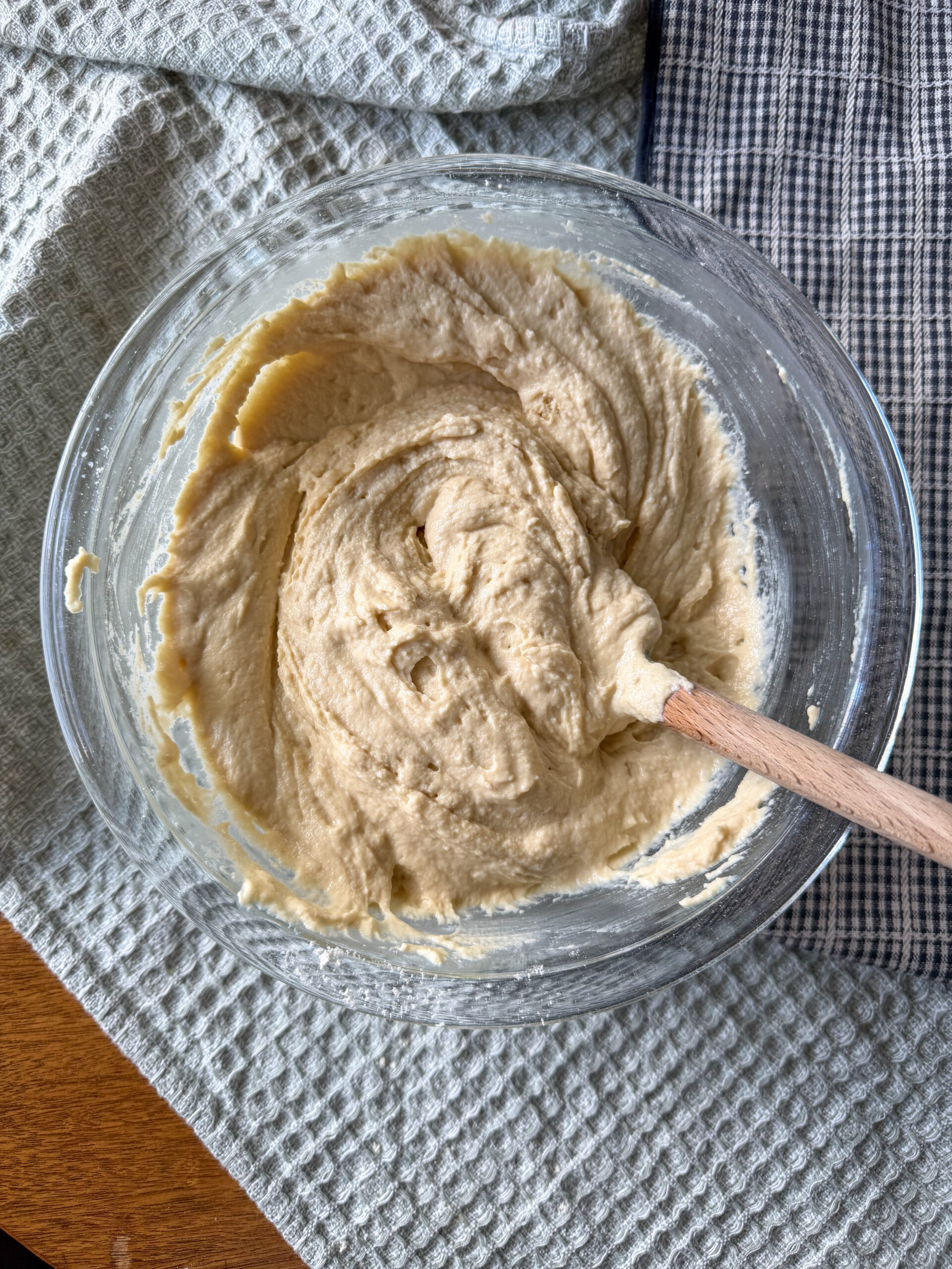 - Step 2: Mix the wet ingredients in a large bowl by whisking together the eggs, Greek yogurt, milk, melted butter (or oil), and vanilla extract until smooth. Add the pancake mix and stir until just combined. The batter should be thick like muffin batter but still spreadable.