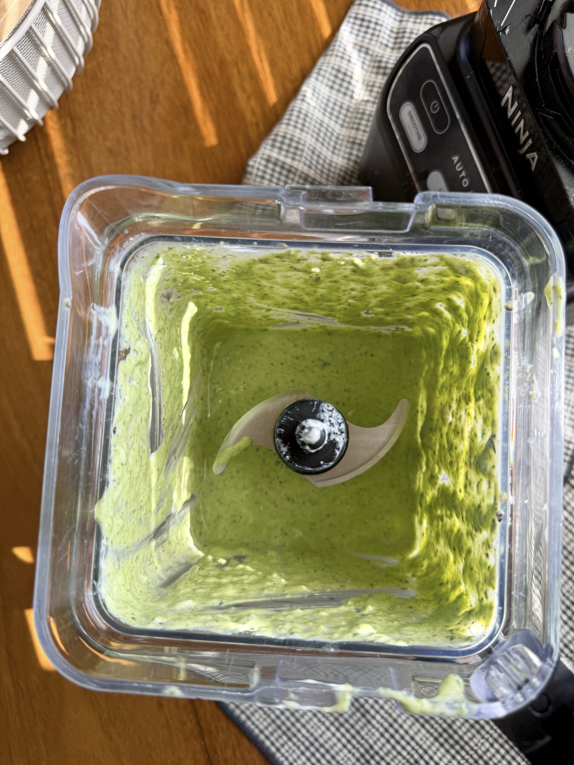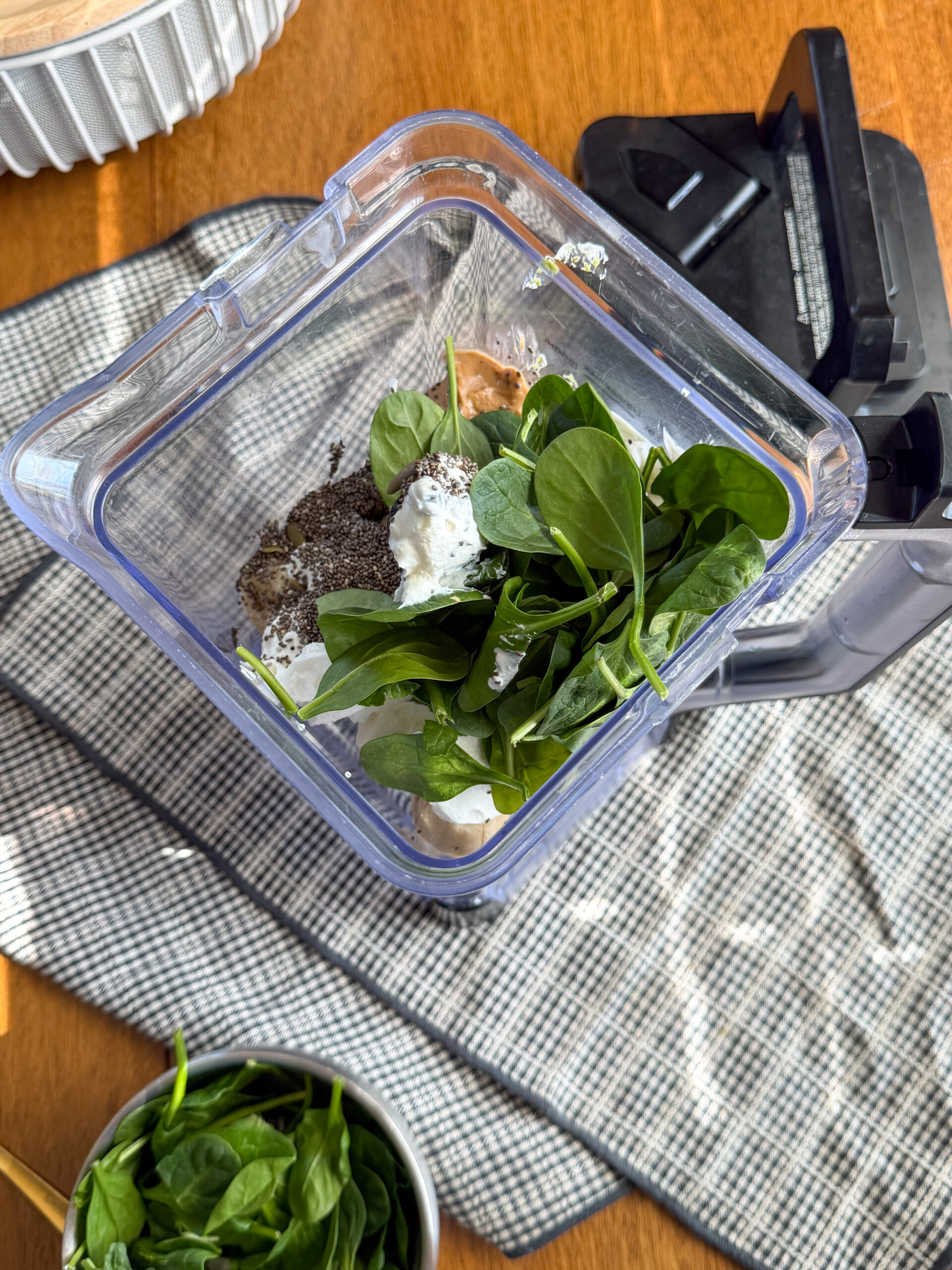 - Add the spinach, frozen banana, Greek yogurt, milk, avocado, cashew butter, chia seeds, and vanilla extract to a blender.