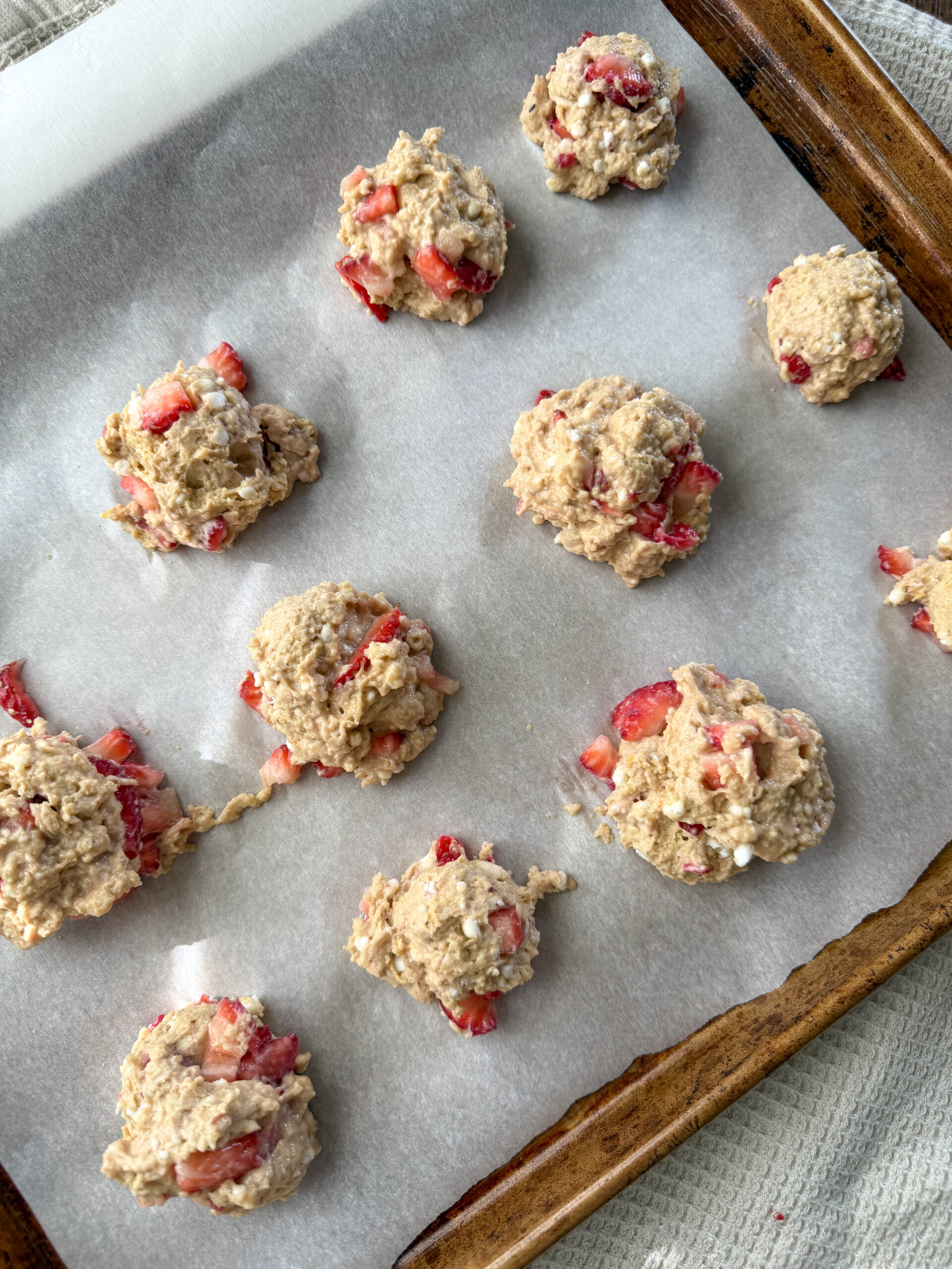 For the softest, most muffin-like tops, keep the batter thick and avoid over-mixing. Finely chop the strawberries so they distribute evenly without releasing too much moisture, and scoop the batter directly onto a parchment-lined baking sheet without flattening. Bake just until set and golden on top, muffin tops should be soft, not totally browned.