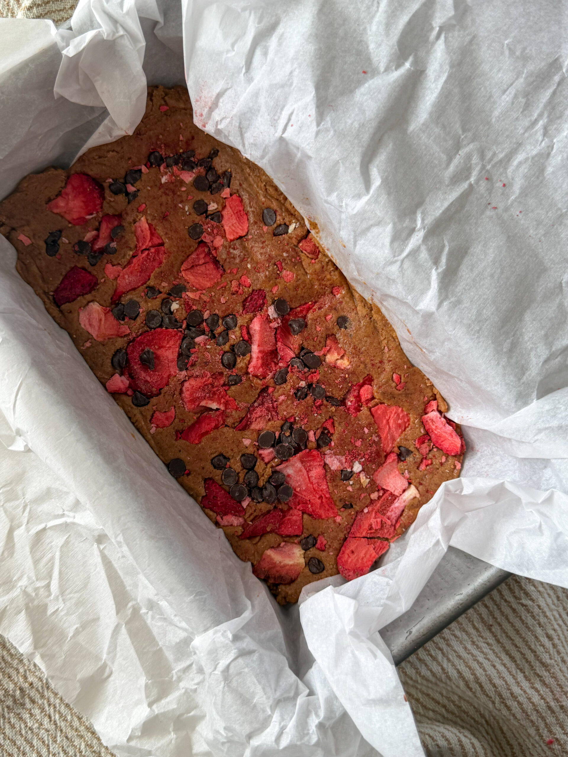 If you love the taste and texture of Perfect Bars but want a more affordable, homemade option, these strawberry protein bars are a great alternative! They’re no bake, made with simple pantry ingredients, and finished with freeze-dried strawberries and mini chocolate chips for a fun, naturally sweet flavor (how perfect for Valentine's day?!).