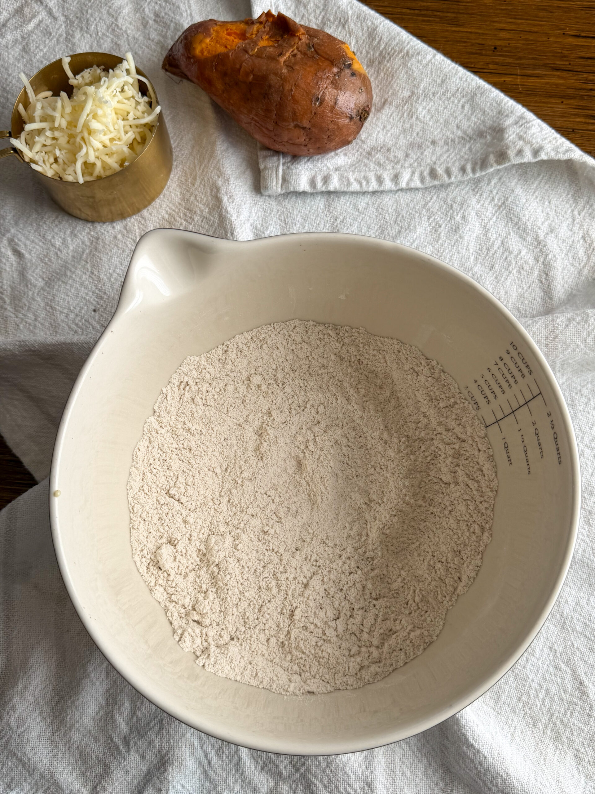 - sweet potato (mashed, cooked) – adds natural sweetness, moisture, and a soft texture that works well for toddlers (sweet potato also helps keep these biscuits tender without needing added sugar)