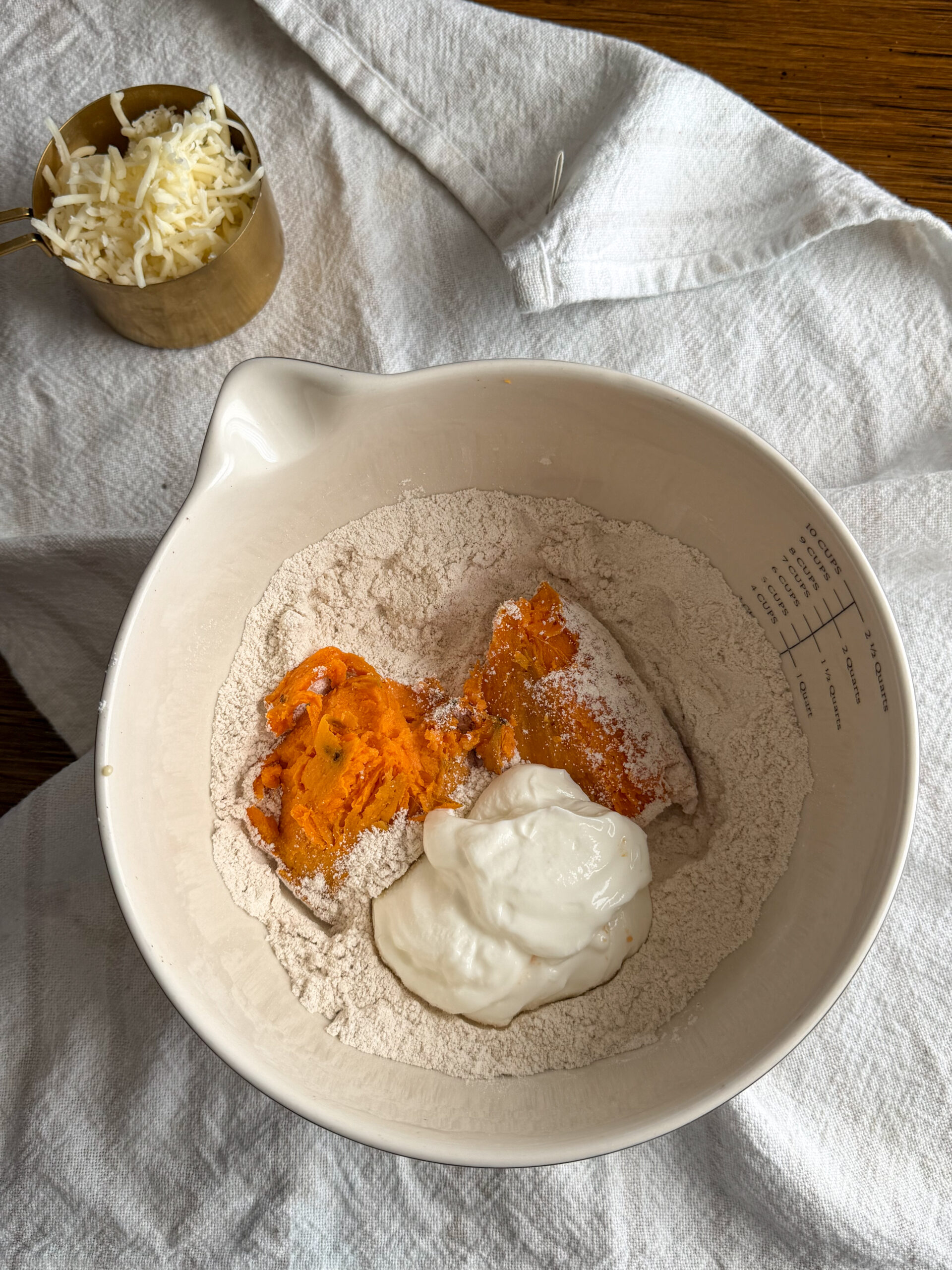 What I love about this version is that it feels balanced without being complicated. The sweet potato adds natural sweetness, Greek yogurt keeps the biscuits soft (plus adds protein), and oat flour makes them hearty without being dense. I usually top them with cheese, bake, and serve alongside fruit or eggs for a quick, low-stress meal. Or you can easily turn them into mini pizza bites!