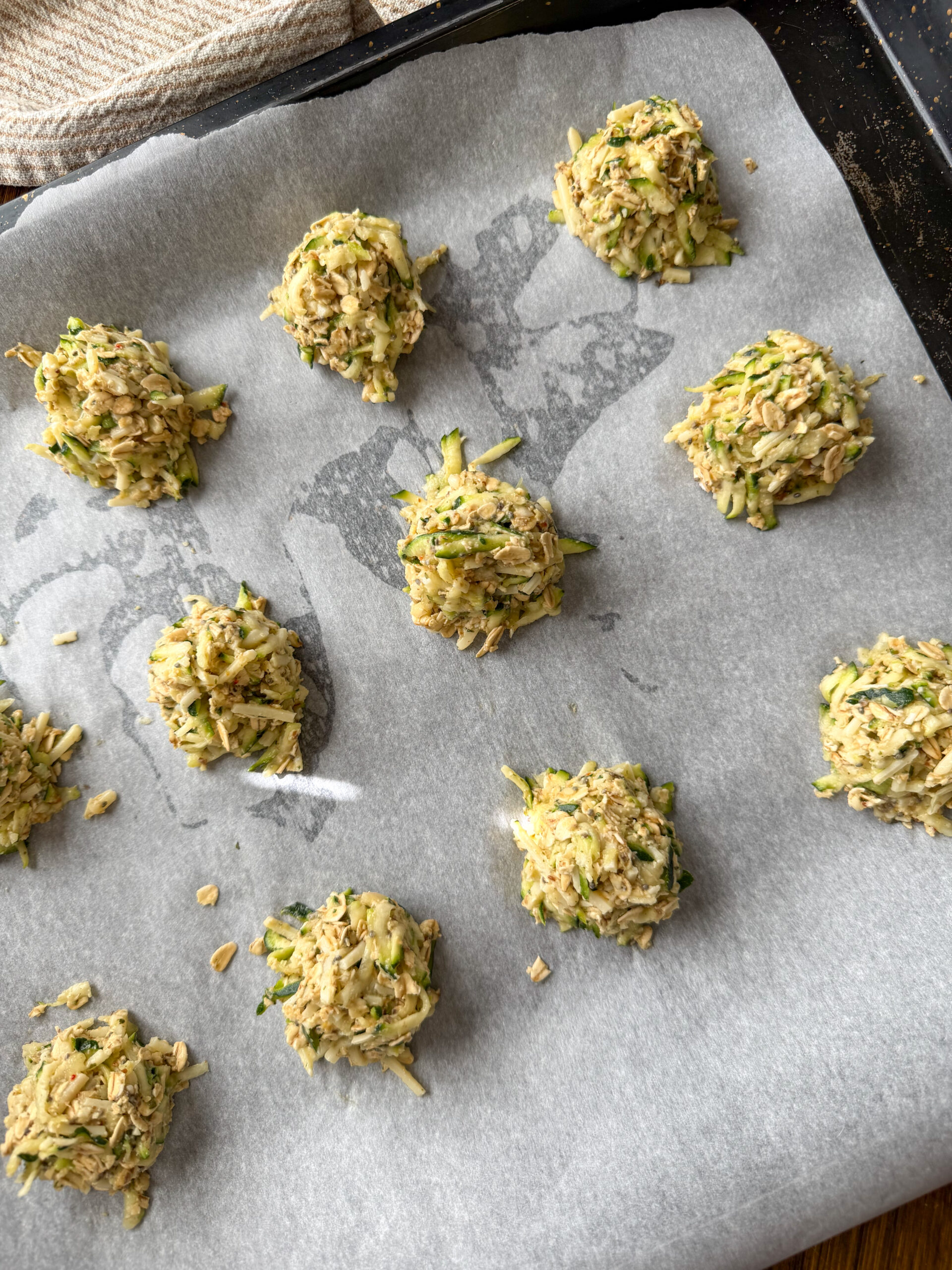 - In a mixing bowl, combine zucchini, egg, cheese, breadcrumbs (or oats), parmesan, and garlic powder. Mix until combined.